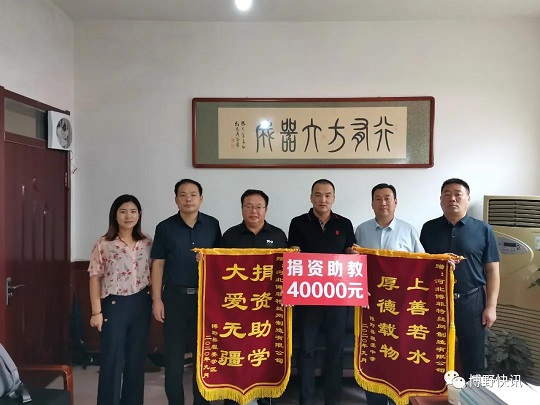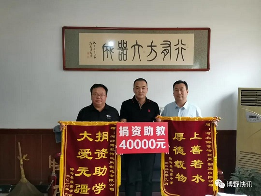 近日,河北博菲特丝网制造有限公司总经理梁月龙为程委镇中学、程委镇中心校捐款四万元,用于支持程委镇教育事业发展。两所学校负责人向河北博菲特丝网制造有限公司赠送锦旗表示感谢。程委镇党委书记赵亚周、镇长杨永参加了此次捐赠。