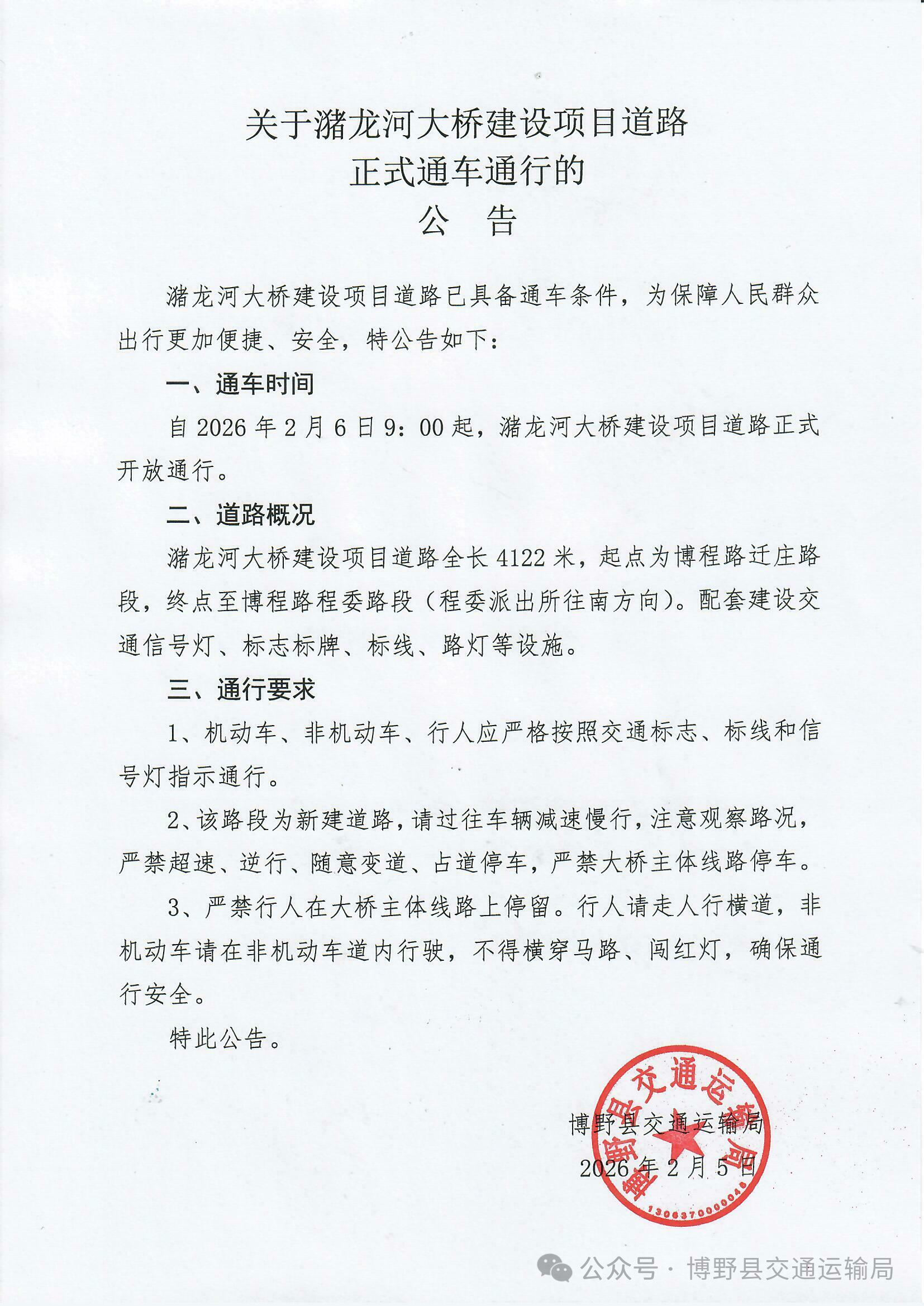 潴龙河大桥建设项目道路已具备通车条件,为保障人民群众出行更加便捷、安全,特公告如下: 一、通车时间自2026年2月6日9:00起,潴龙河大桥建设项目道路正式开放通行。 二、道路概况潴龙河大桥建设项目道路全长4122米,起点为博程路迁庄路段,终点至博程路程委路段(程委派出所往南方向)。配套建设交通信号灯、标志标牌、标线、路灯等设施。 三、通行要求 1、机动车、非机动车、行人应严格按照交通标志、标线和信号灯指示通行。 2、该路段为新建道路,请过往车辆减速慢行,注意观察路况,严禁超速、逆行、随意变道、占道停车,严禁大桥主体线路停车。 3、严禁行人在大桥主体线路上停留。行人请走人行横道,非机动车请在非机动车道内行驶,不得横穿马路、闯红灯,确保通行安全。 特此公告。 博野县交通运输局 2026年2月5日