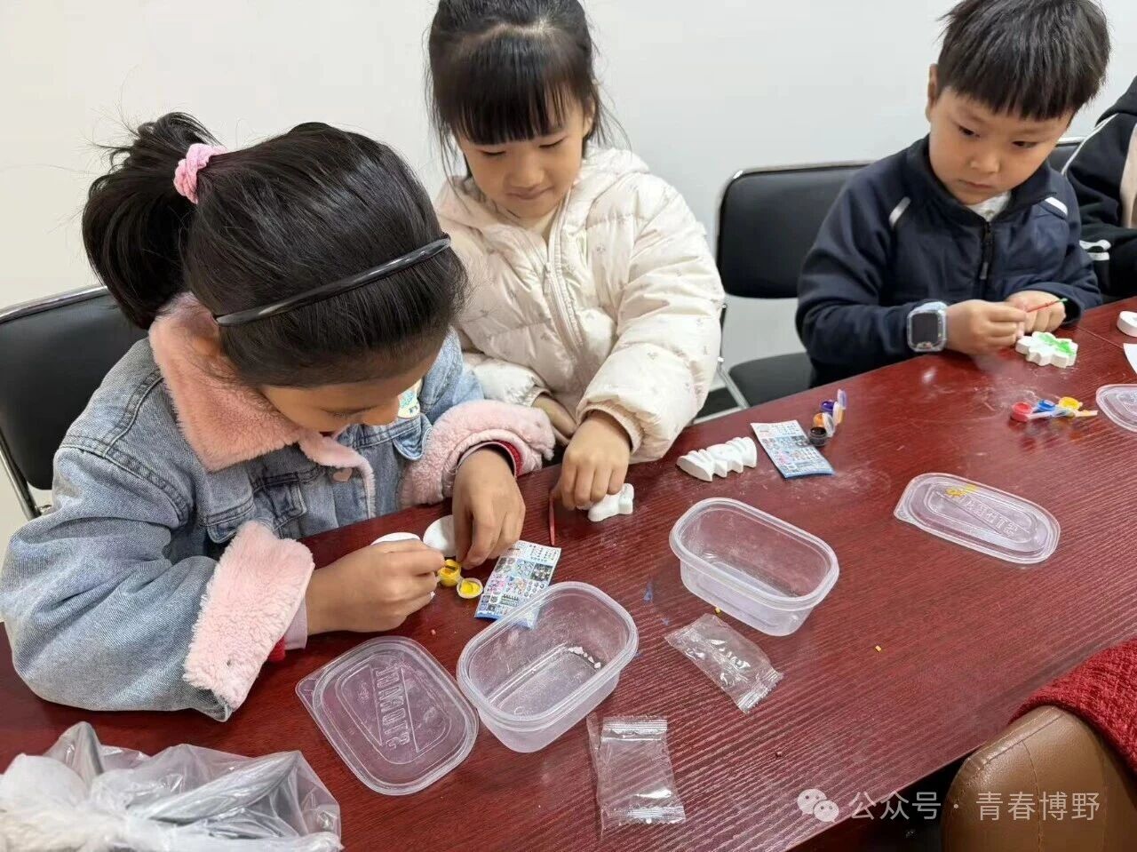 孩子们纷纷拿起画笔,精心调色、细心描绘,用五彩斑斓的色彩为石膏娃娃赋予生机与活力,在动手创作中发挥想象力、培养专注力,现场充满欢声笑语,氛围温馨又热闹。