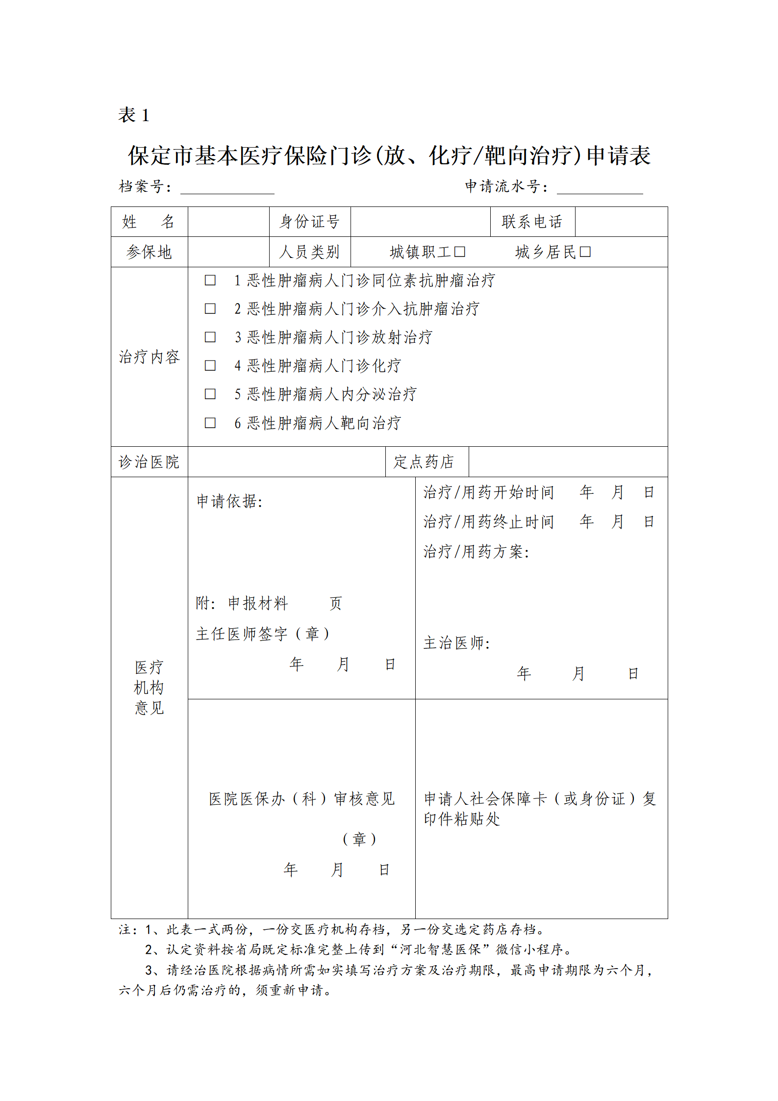 为适配业务调整需求,现将原门诊放化疗申请表与原I类药品申请表整合为《保定市基本医疗保险门诊(放化疗/靶向治疗)申请表》(见表1),Ⅱ类药品按照《Ⅱ类药品用药申请表》(见表2)审批,自2026年1月21日起统一使用新版审批表办理相关医保审批业务,旧版两表同步废止。