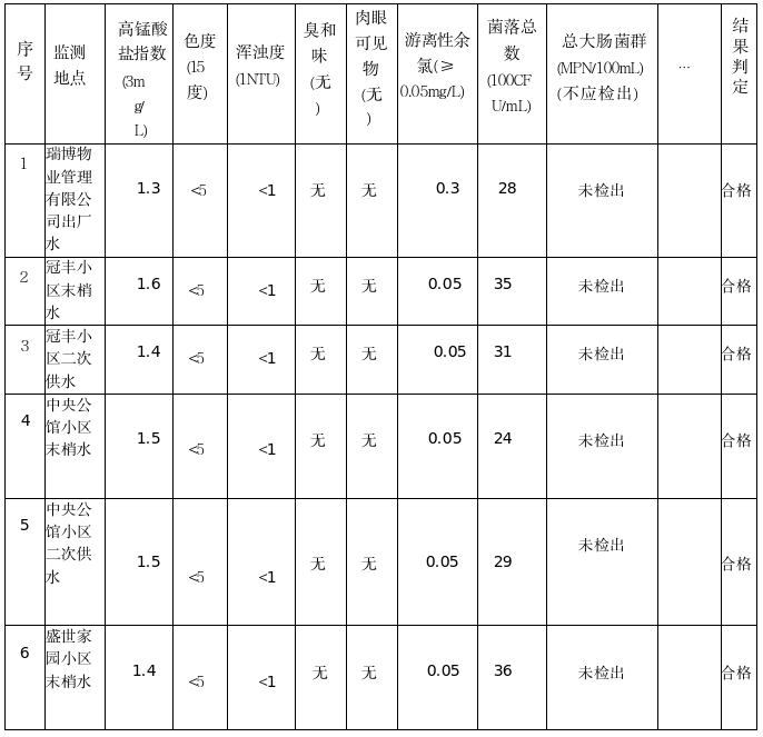 博野县本季度共设置用户水龙头水监测 6 处,分别为1、瑞博物业管理有限公司出厂水2、冠丰小区末梢水3、冠丰小区二次供水4、中央公馆小区末梢水5、中央公馆小区二次供水6、盛世家园小区末梢水;监测指标涵盖浑浊度、色度、臭和味、肉眼可见物、高锰酸盐指数、游离氯、菌落总数、总大肠菌群等,共 8 项。 博野县疾控中心采集水样并按照《生活饮用水标准检验方法》(GB/T  5750-2023) 进行检测。检测结果显示,各项指标均符合《生活饮用水卫生标准》 (GB 5749-2022)  限值要求,总体合格率100%(或哪些指标不合格等)。