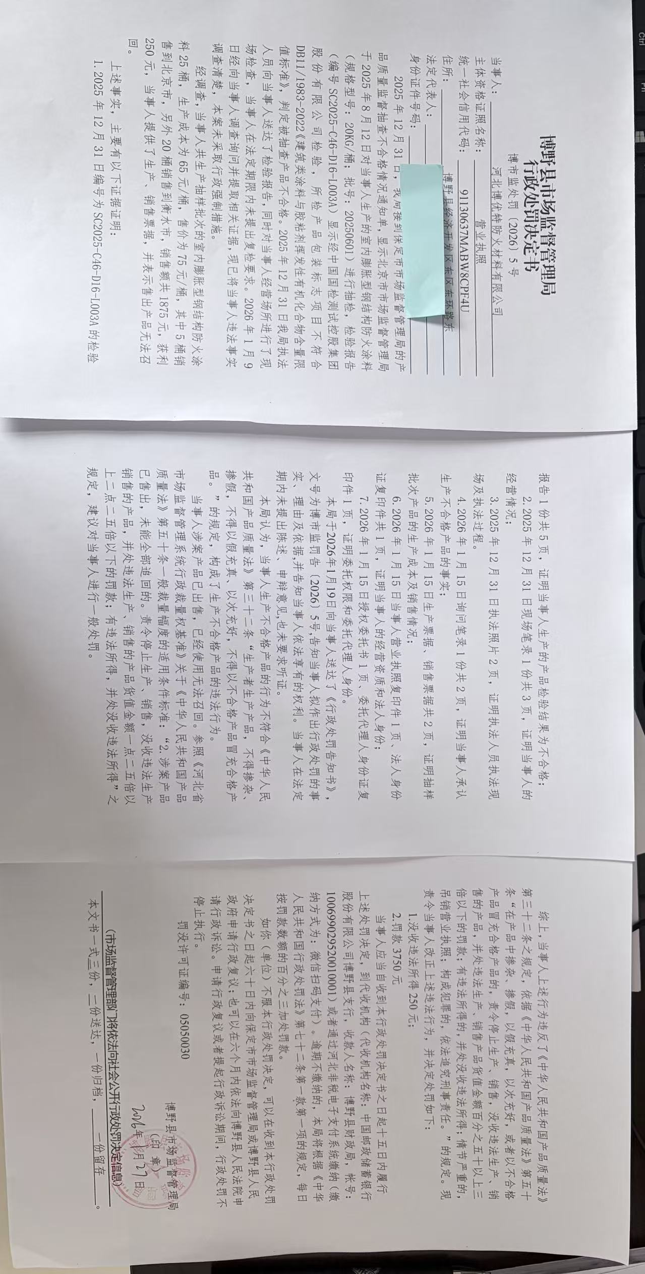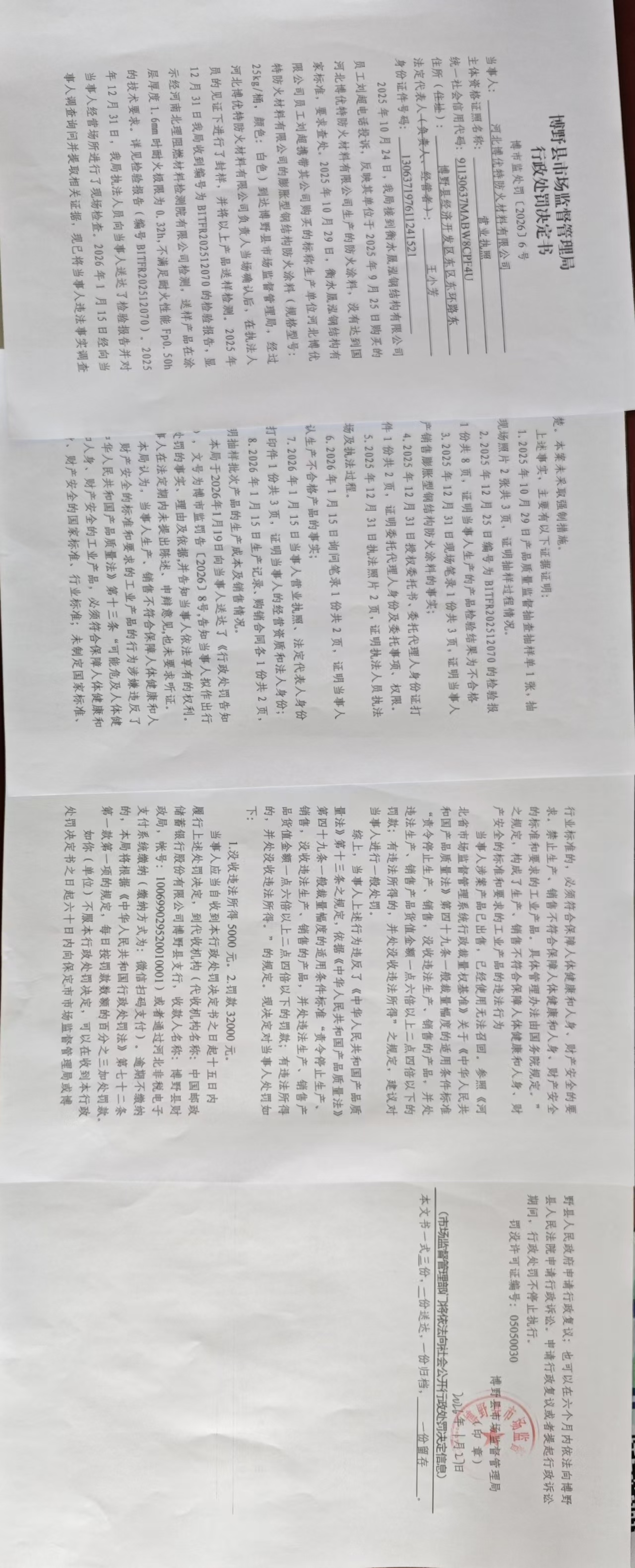 | 博市监处罚【2026】5号 | 河北博优特防火材... | 生产不合格产品 | 罚款、没收违法所得 | 2026-01-27 | 博野县市场监督管理局 | 点击查看 |