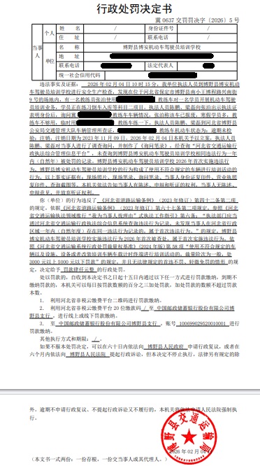 | 冀 0637 交罚罚决字〔2026〕5号 | 博野县博安机动车... | 博野县博安机动车... | 罚款 | 2026-02-04 | 博野县交通运输局 | 点击查看 |