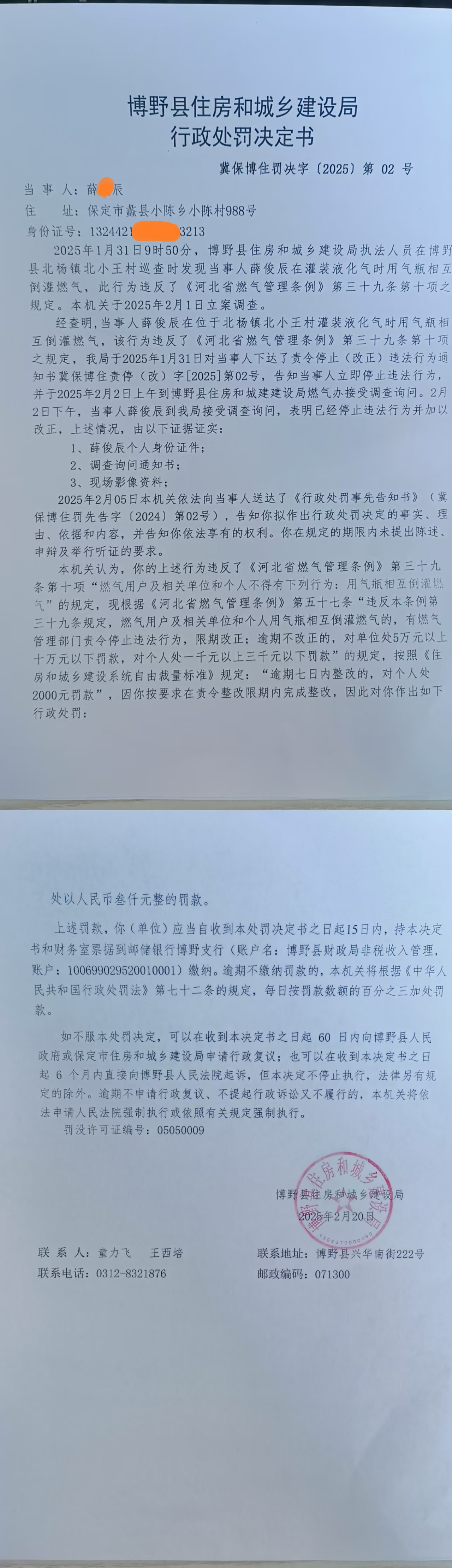 | 冀保博住罚决字【2025】第02号 | 薛*辰 | 当事人薛*辰存在... | 罚款 | 2025-02-20 | 博野县住房和城乡建设局 | 点击查看 |