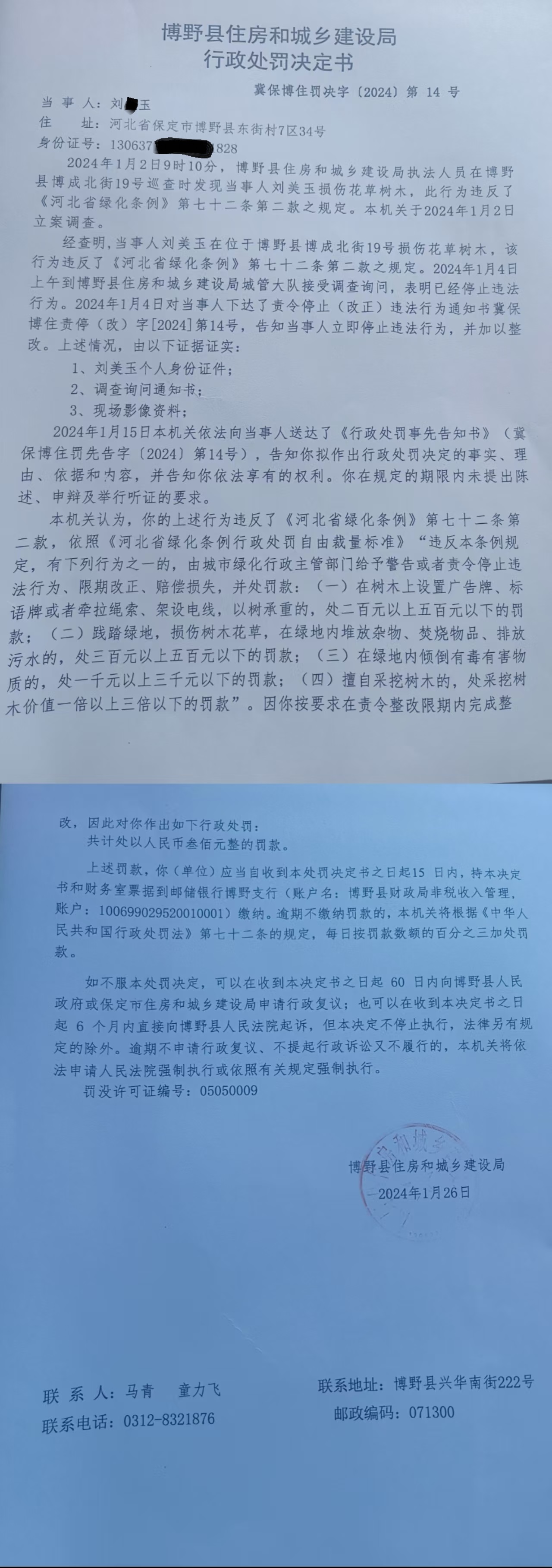 | 冀保博住罚决字【2024】第14号 | 刘*玉 | 当事人刘*玉损伤... | 罚款 | 2024-01-26 | 博野县住房和城乡建设局 | 点击查看 |