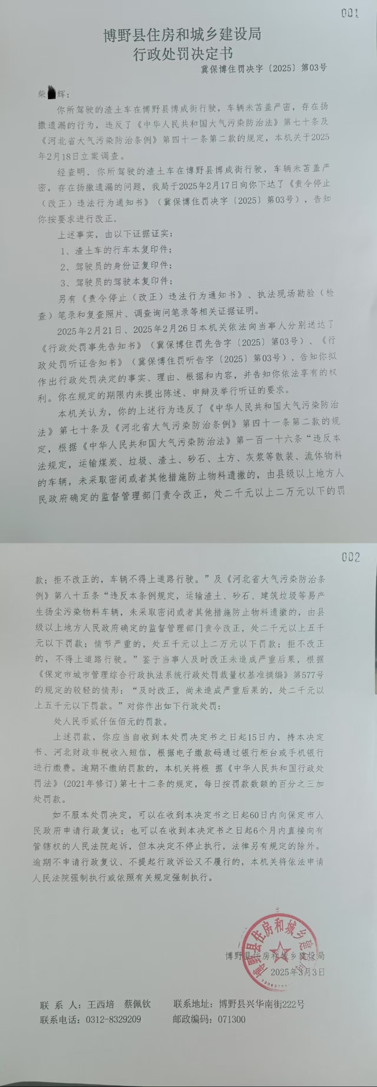 | 冀保博住罚决字【2025】第03号 | 柴*辉 | 当事人柴*辉驾驶... | 罚款 | 2025-03-03 | 博野县住房和城乡建设局 | 点击查看 |