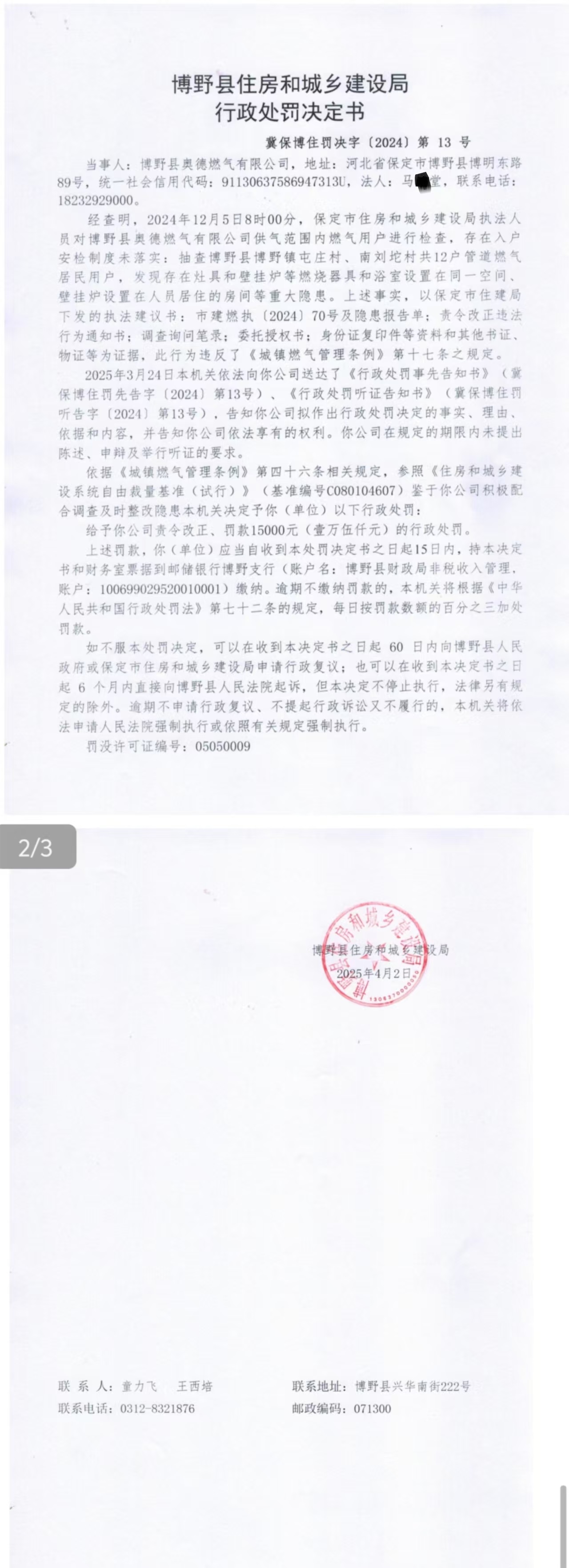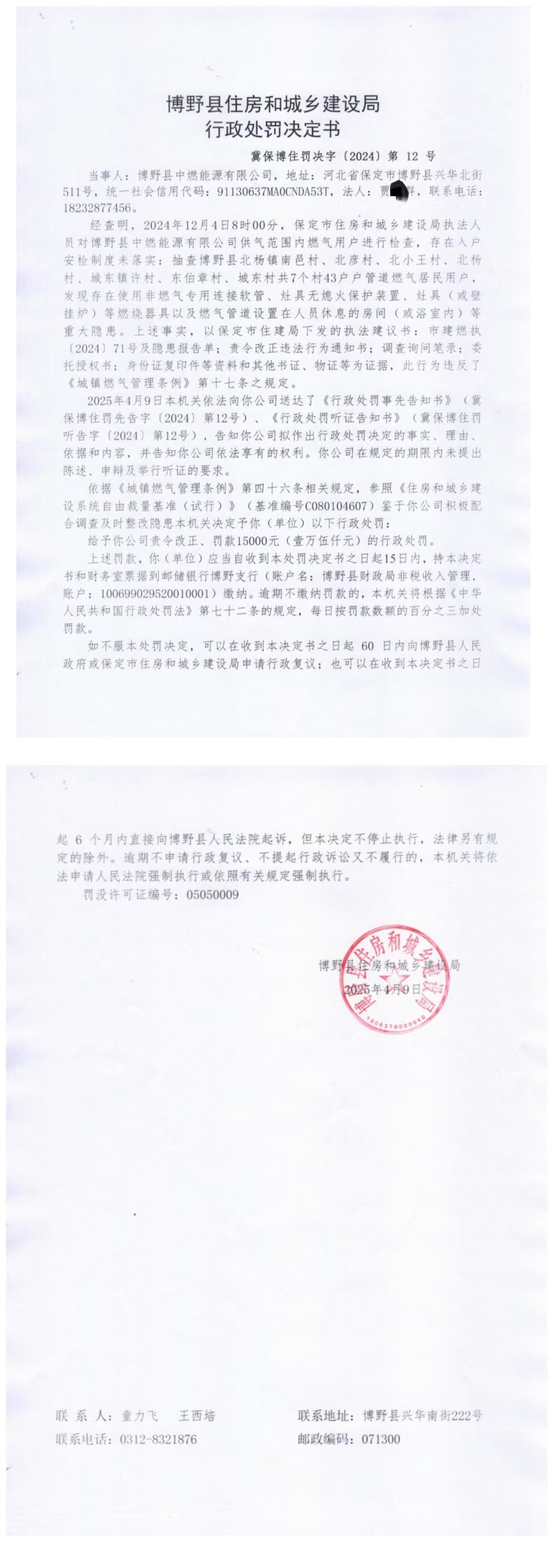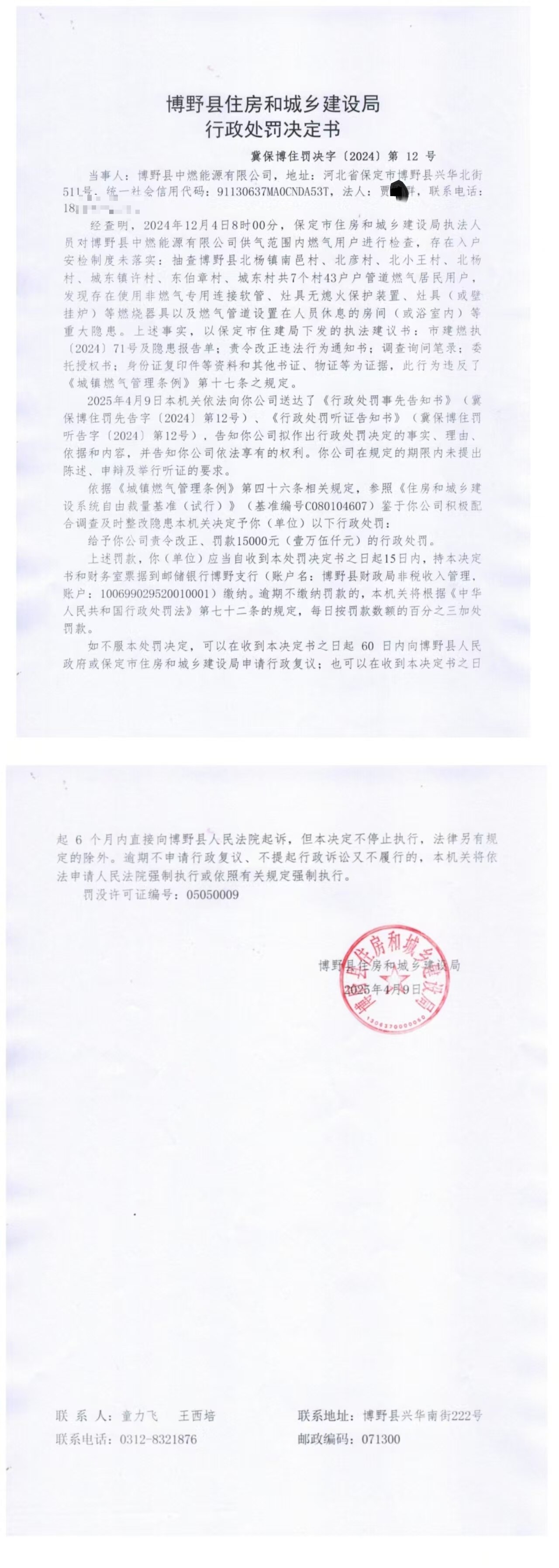 | 冀保博住罚决字【2024】第12号 | 博野县中燃能源有... | 博野县中燃能源有... | 罚款 | 2025-04-09 | 博野县住房和城乡建设局 | 点击查看 |