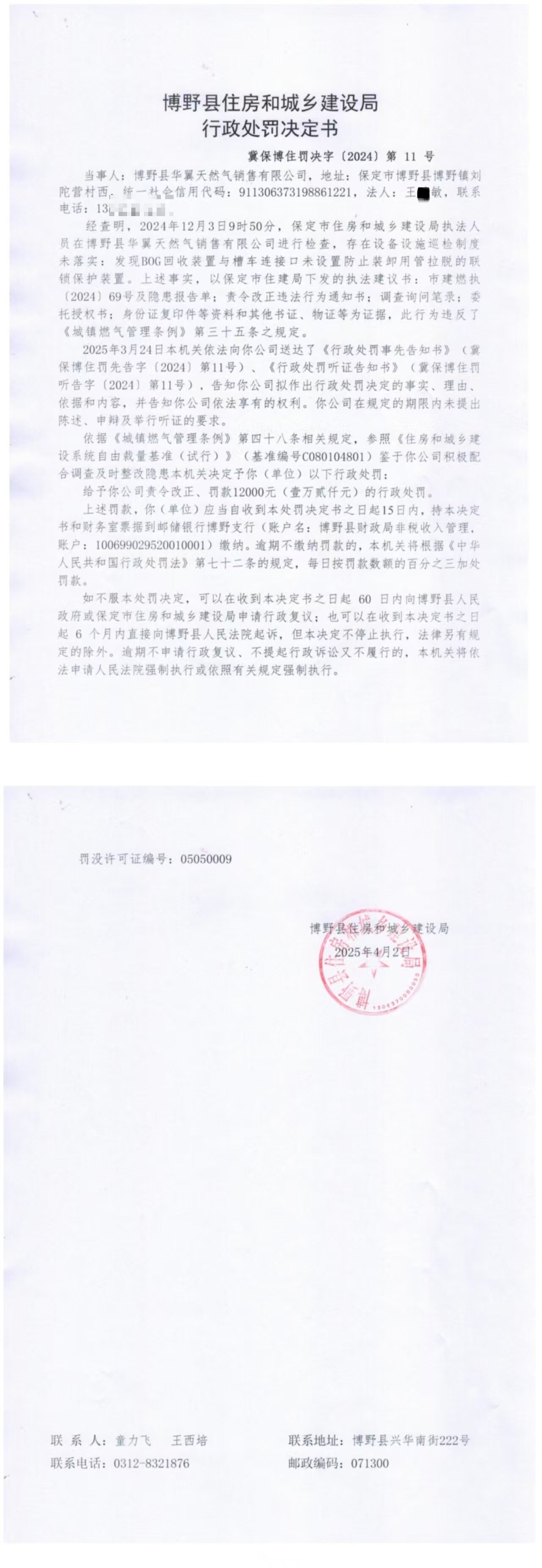 | 冀保博住罚决字【2024】第11号 | 博野县华翼天然气... | 博野县华翼天然气... | 罚款 | 2025-04-02 | 博野县住房和城乡建设局 | 点击查看 |