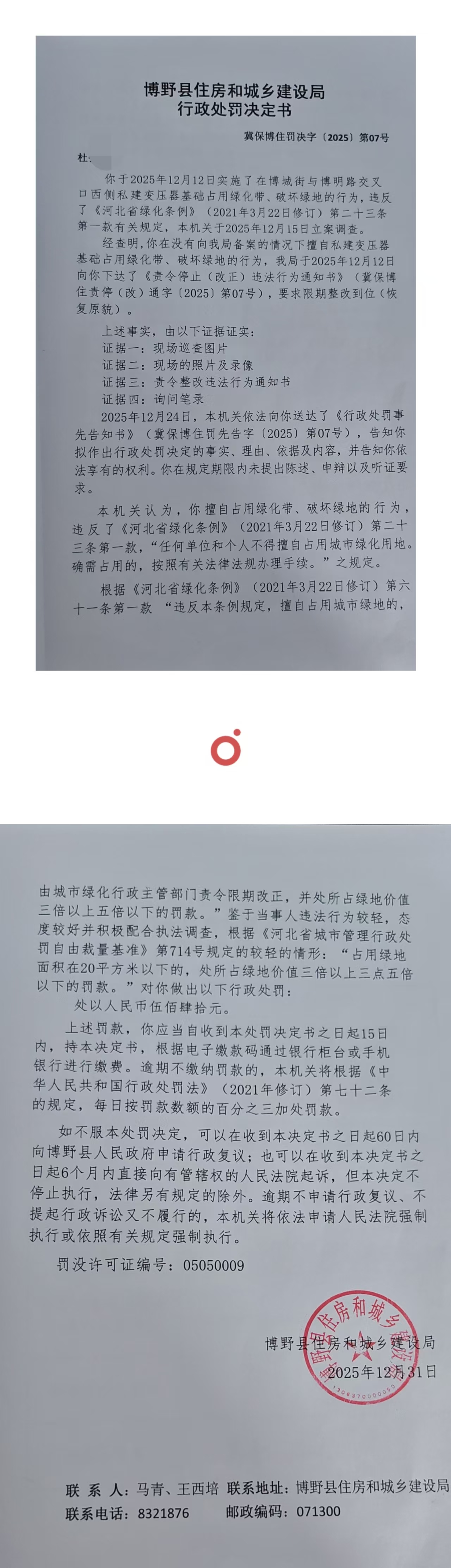| 冀保博住罚决字【2025】第7号 | 杜** | 当事人私建变压器... | 罚款 | 2025-12-31 | 博野县住房和城乡建设局 | 点击查看 |
