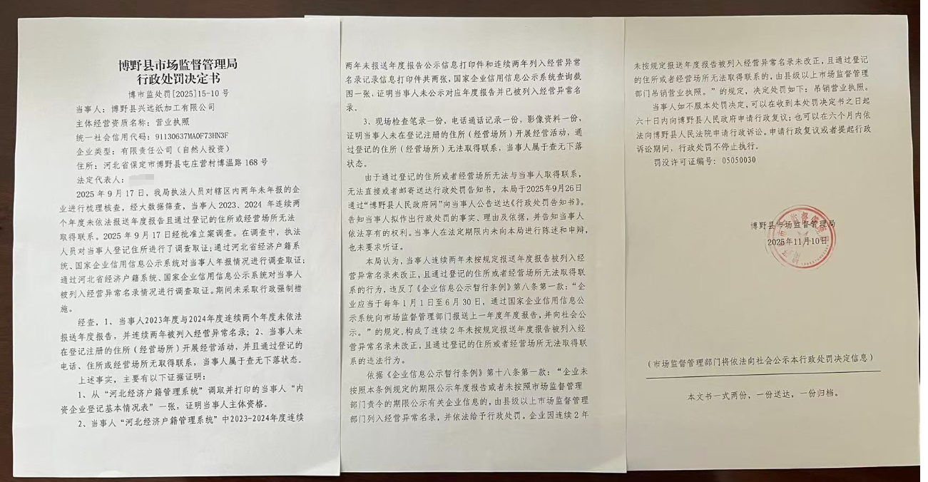 | 博市监处罚〔2025〕15-10号 | 博野县兴远纸加工... | 连续2年未按规定... | 吊销许可证 | 2025-11-10 | 博野县市场监督管理局 | 点击查看 |