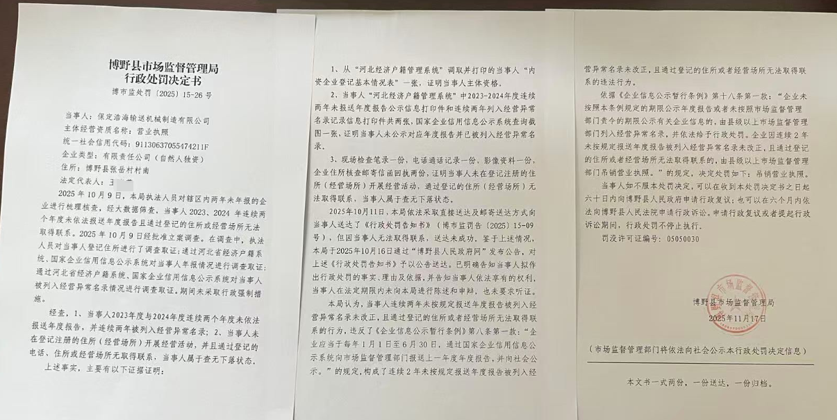 | 博市监处罚〔2025〕15-26号 | 保定浩海输送机械... | 连续2年未按规定... | 吊销许可证 | 2025-11-17 | 博野县市场监督管理局 | 点击查看 |