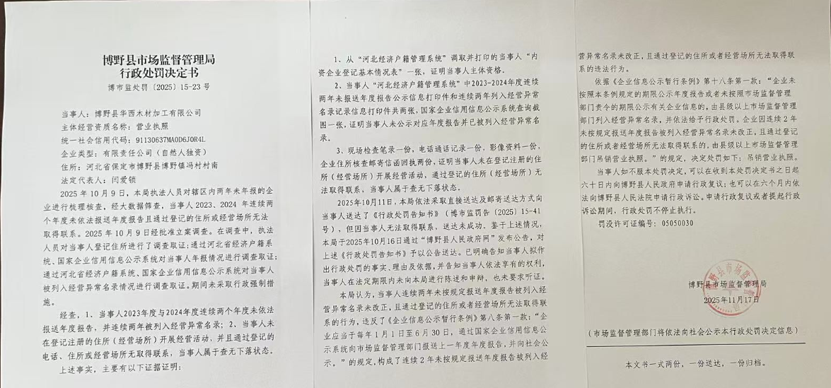 | 博市监处罚〔2025〕15-23号 | 博野县华西木材加... | 连续2年未按规定... | 吊销许可证 | 2025-11-17 | 博野县市场监督管理局 | 点击查看 |