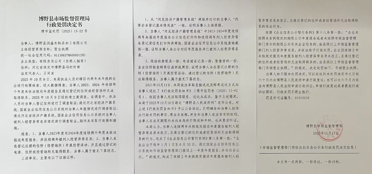 | 博市监处罚〔2025〕15-22号 | 博野县润盛木制品... | 连续2年未按规定... | 吊销许可证 | 2025-11-17 | 博野县市场监督管理局 | 点击查看 |