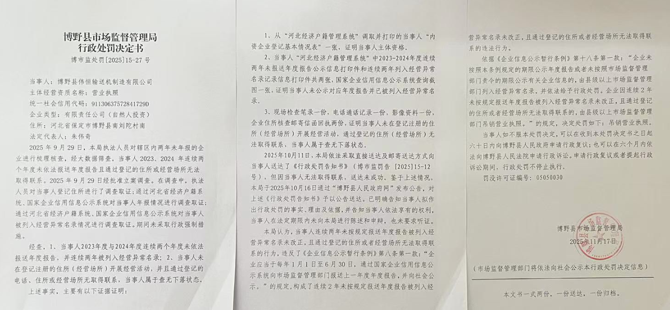 | 博市监处罚〔2025〕15-27号 | 博野县伟恒输送机... | 连续2年未按规定... | 吊销许可证 | 2025-11-17 | 博野县市场监督管理局 | 点击查看 |