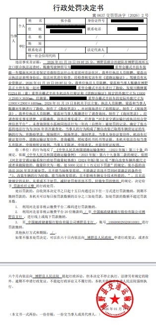 | 冀 0637 交罚罚决字〔2026〕2号 | 张小磊 | 张小磊擅自改装已... | 罚款 | 2026-01-19 | 博野县交通运输局 | 点击查看 |