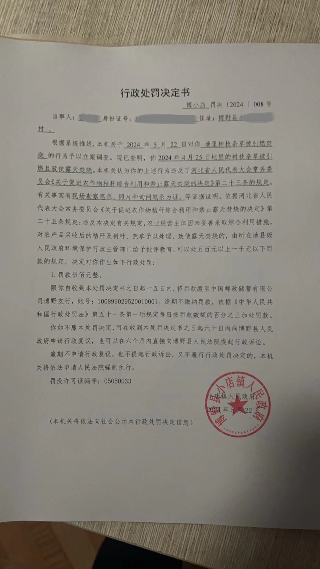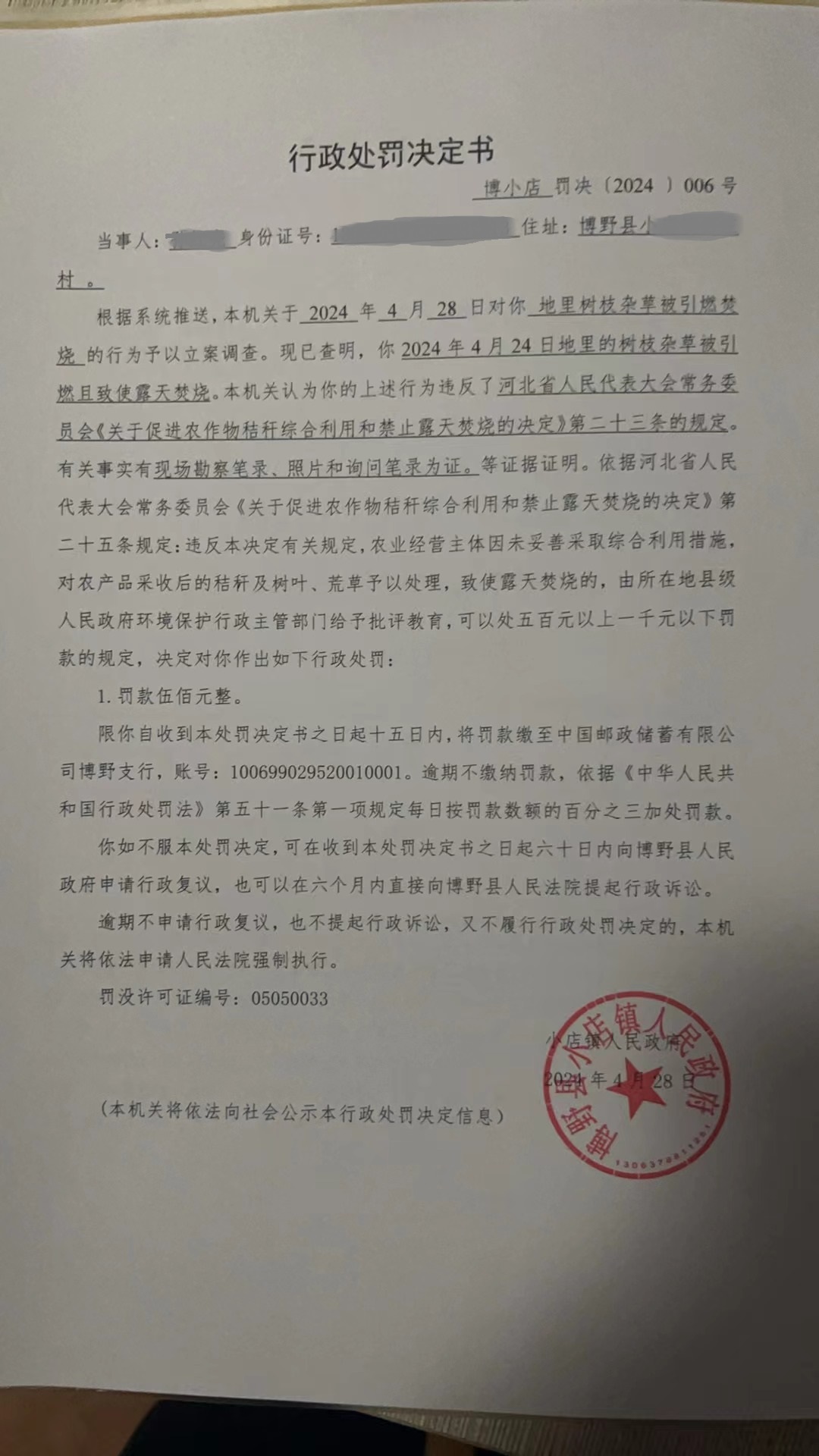 | 博小店罚决【2024】005号 | 吴杨 | 吴杨露天焚烧垃圾... | 罚款 | 2024-04-12 | 博野县小店镇人民政府 | 点击查看 |