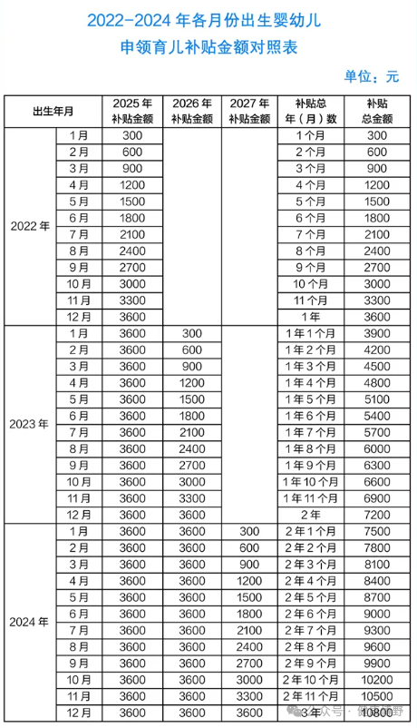 2025年7月,《育儿补贴制度实施方案》正式发布,明确对符合法律法规规定生育的3周岁以下婴幼儿发放补贴。根据方案,2022年出生的婴幼儿,可申领一次,应当在2025年提出申请;2023年出生的婴幼儿,可申领2次,分别在2025年和2026年提出申请;2024年出生的婴幼儿,可申领3次,分别在2025年、2026年和2027年提出申请。每个孩子能够申领的金额,具体参见下表: